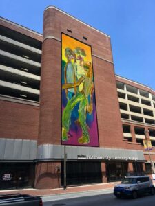 Downtown Baltimore got a surprise this April, with the reveal of a large format work of art affixed to the side of Harbor Park Garage, a parking garage located at 55 Market Place. The artwork, which is visible from the Jones Falls Expressway, is a custom piece by artist Edie Beaucage.