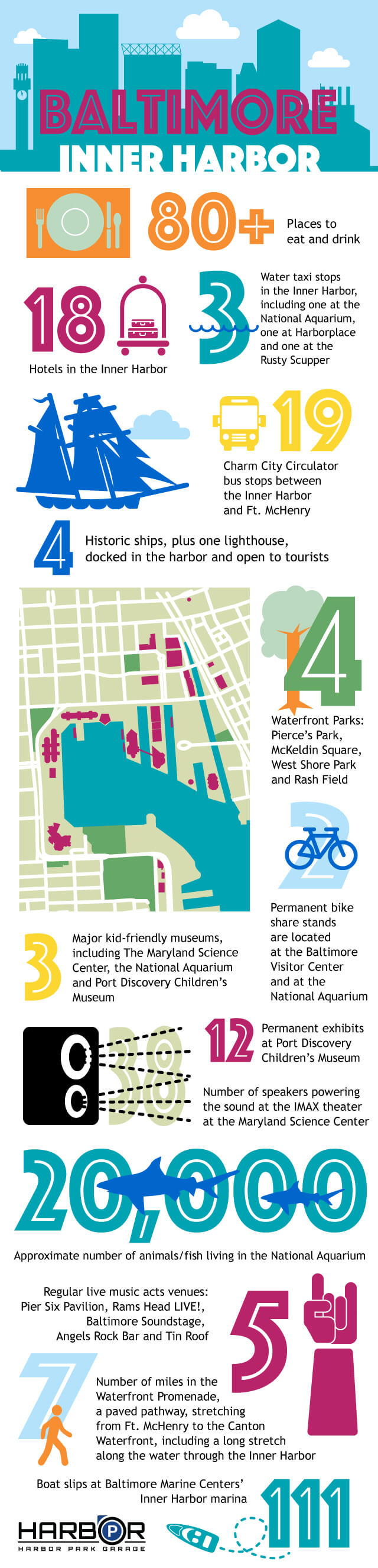 As some of you know, Harbor Park Garage serves the Inner Harbor area when it comes to inner harbor parking, especially with the surrounding neighborhoods. Our team has come up with an infographic on what makes the area unique by compiling a numbered list of shopping areas, entertainment centers, hotels, restaurants and much more for Baltimore’s Inner Harbor. Feel free to download our infographic or bookmark this article for the list!