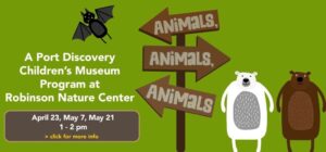 Learn about animals and nature with playful, fun and free programming from Port Discovery at the Robinson Nature Center on May 7 and May 21! Using movement, games, science and interactive theater play, children three and up will explore our wild planet, creatures of the night and more! Programs are held at 1 & 2PM and are free with a Robinson pass or daily admission to the nature center.